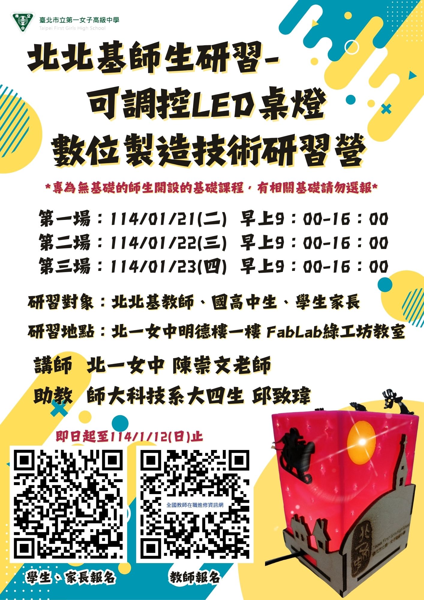 | 公告主旨 | 函轉 臺北市立第一女子高級中學114年度新興科技教育遠距示範服務計畫舉辦 【北北基師生研習—可調控LED桌燈數位製造技術研習 營】資訊 |